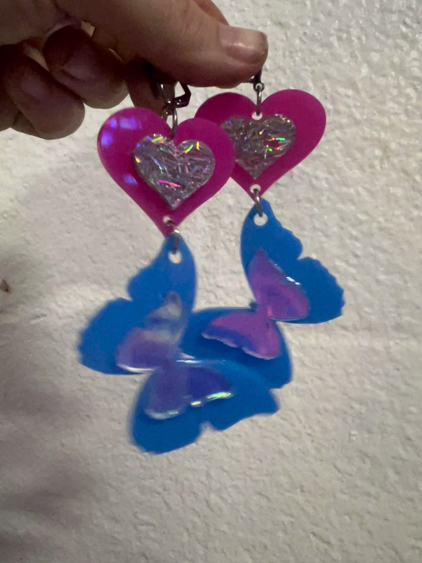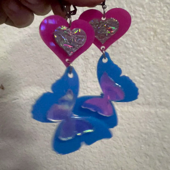 holographic Butterfly and silver glitter Moon plexiglass and iridescent plexi earrings.