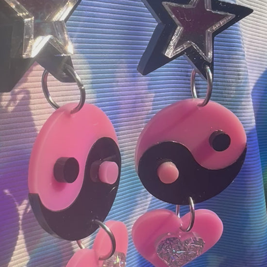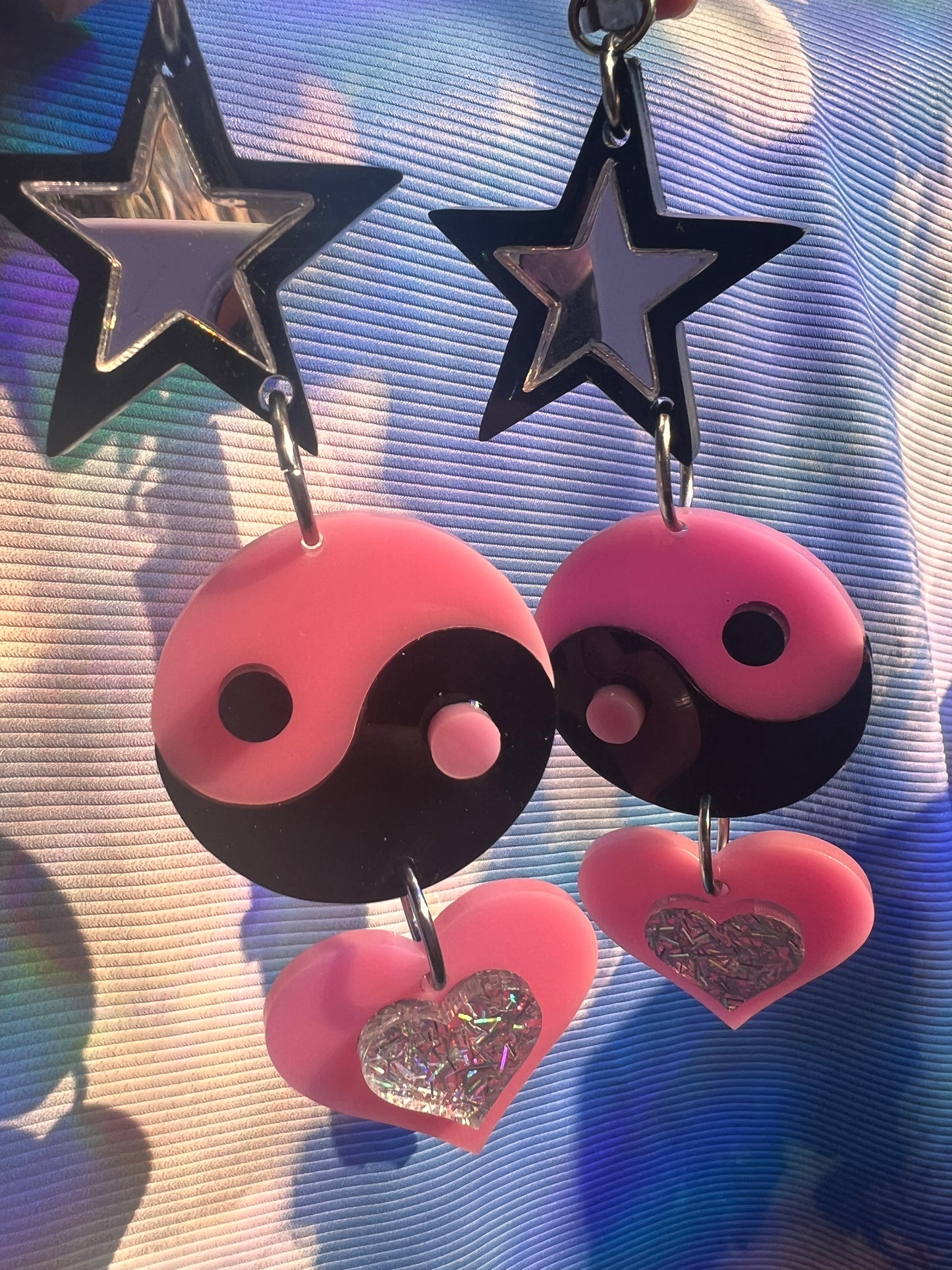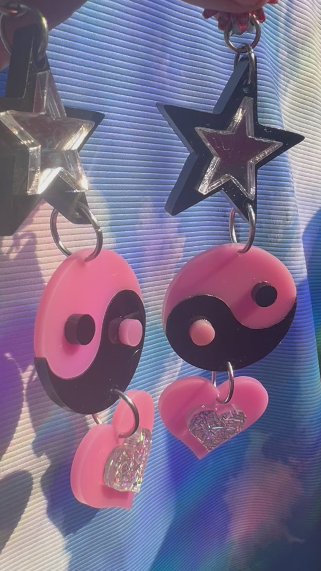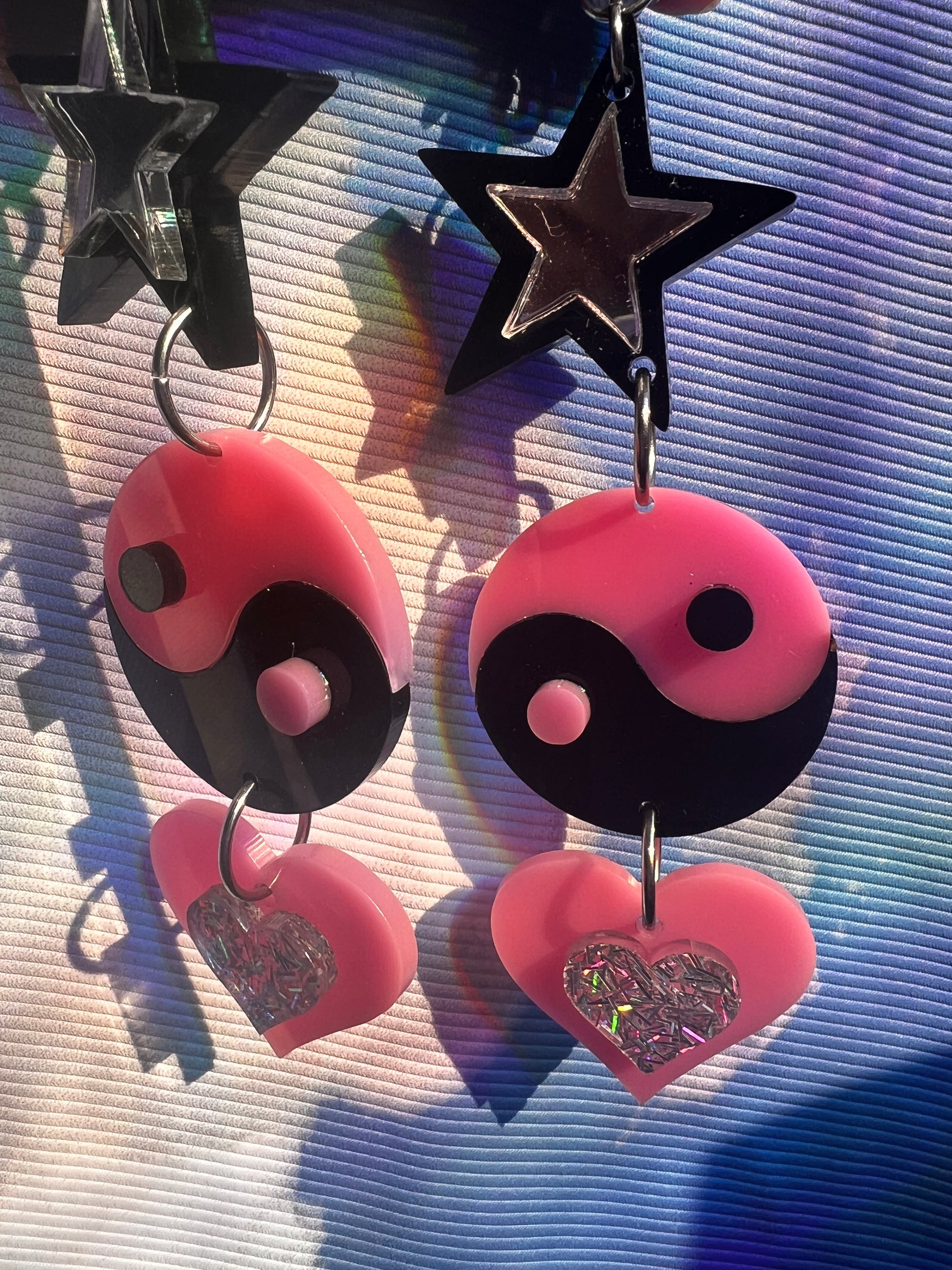 Neon green plexi cactus and sparkle pink plexi hearts.