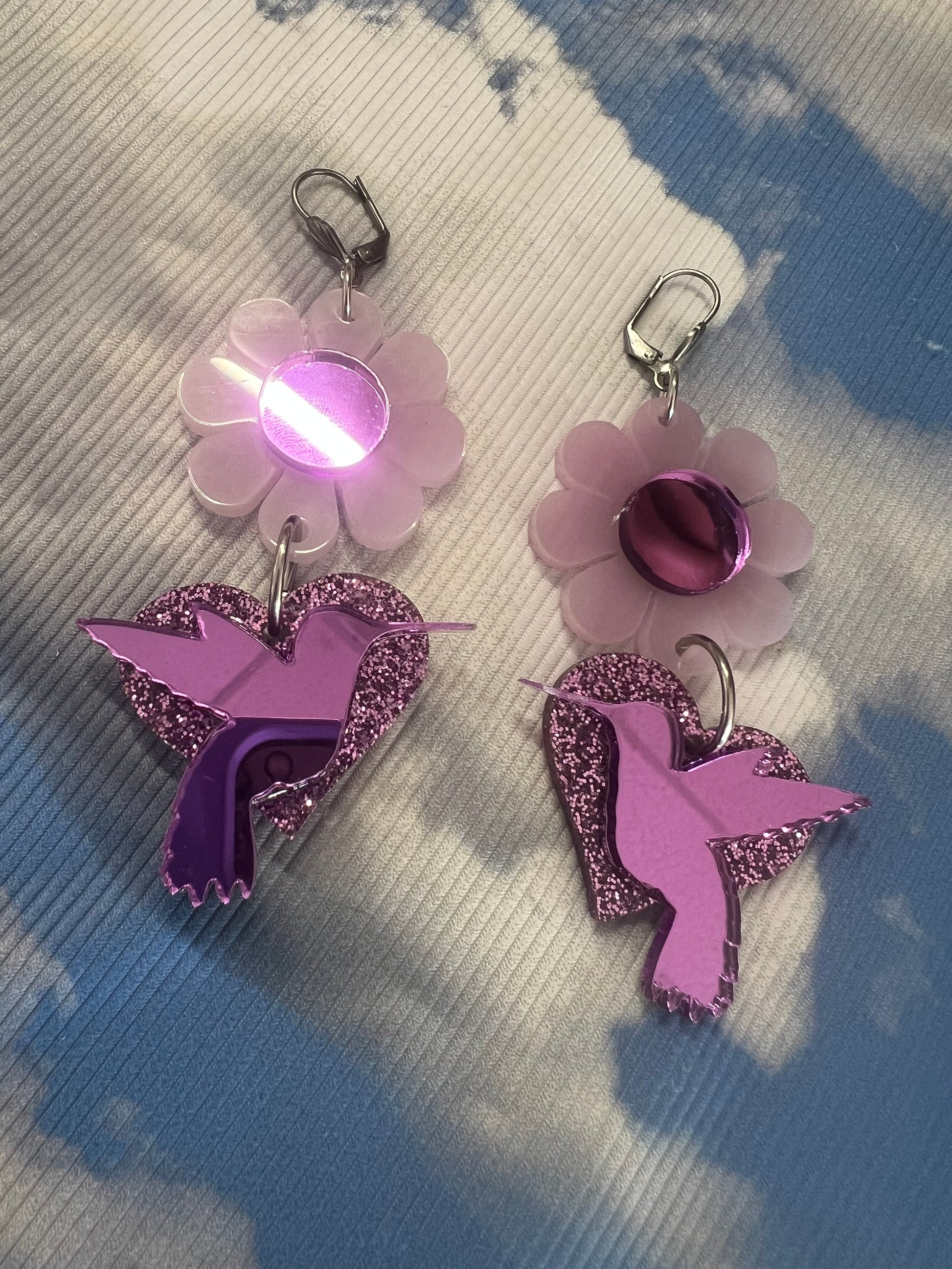 Dangle  heart love earrings with  hummingbirds layered on the heart