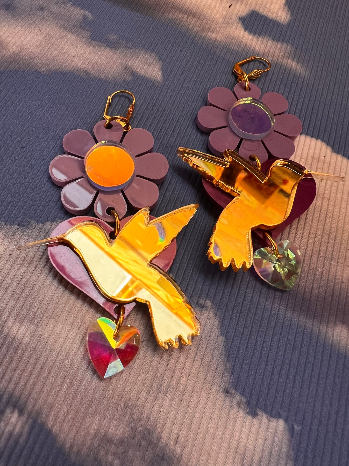 Dangle  heart love earrings with  hummingbirds layered on the heart