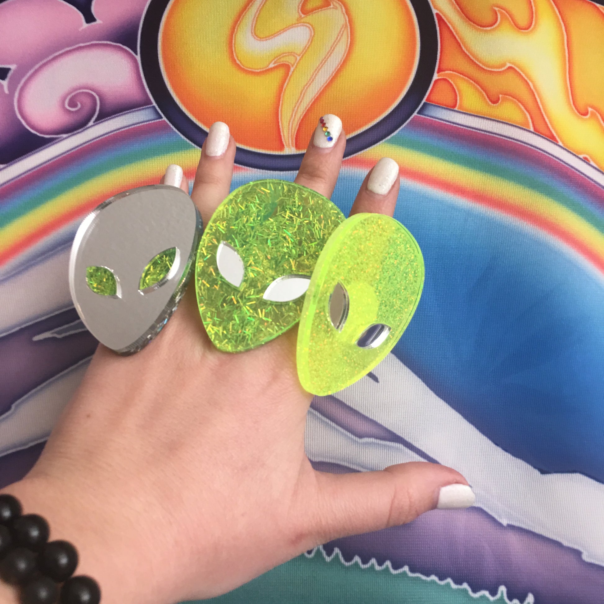 plexiglass mirror alien cut out layered on glitter and neon plexi for an added uv reactive effect at parties 👽💜 .