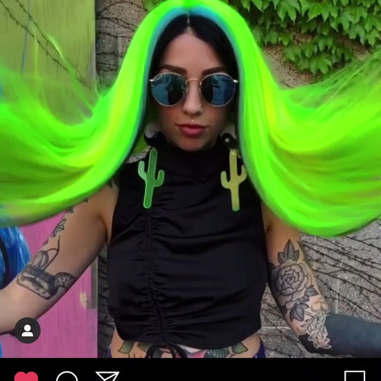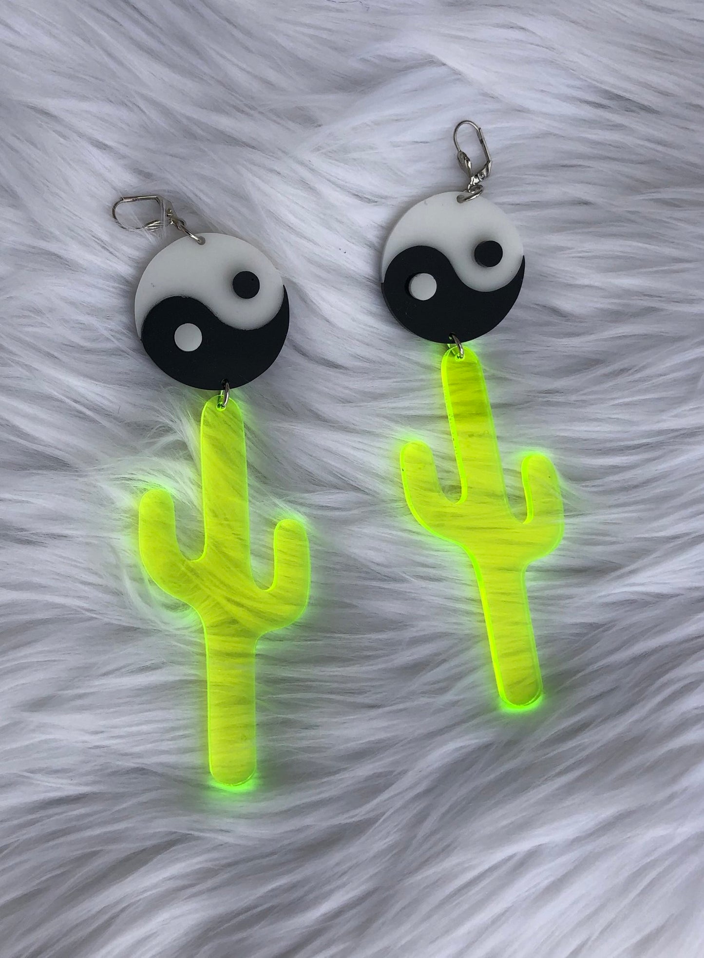 Neon green plexi cactus and sparkle pink plexi hearts.