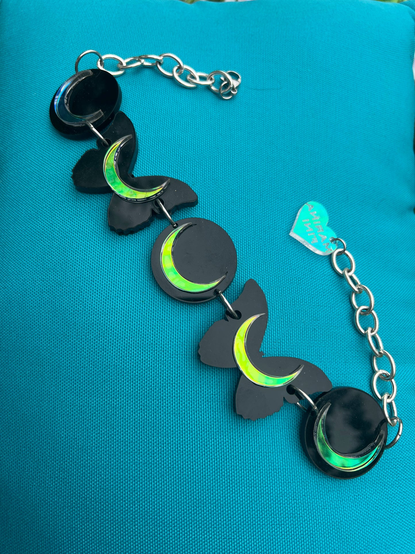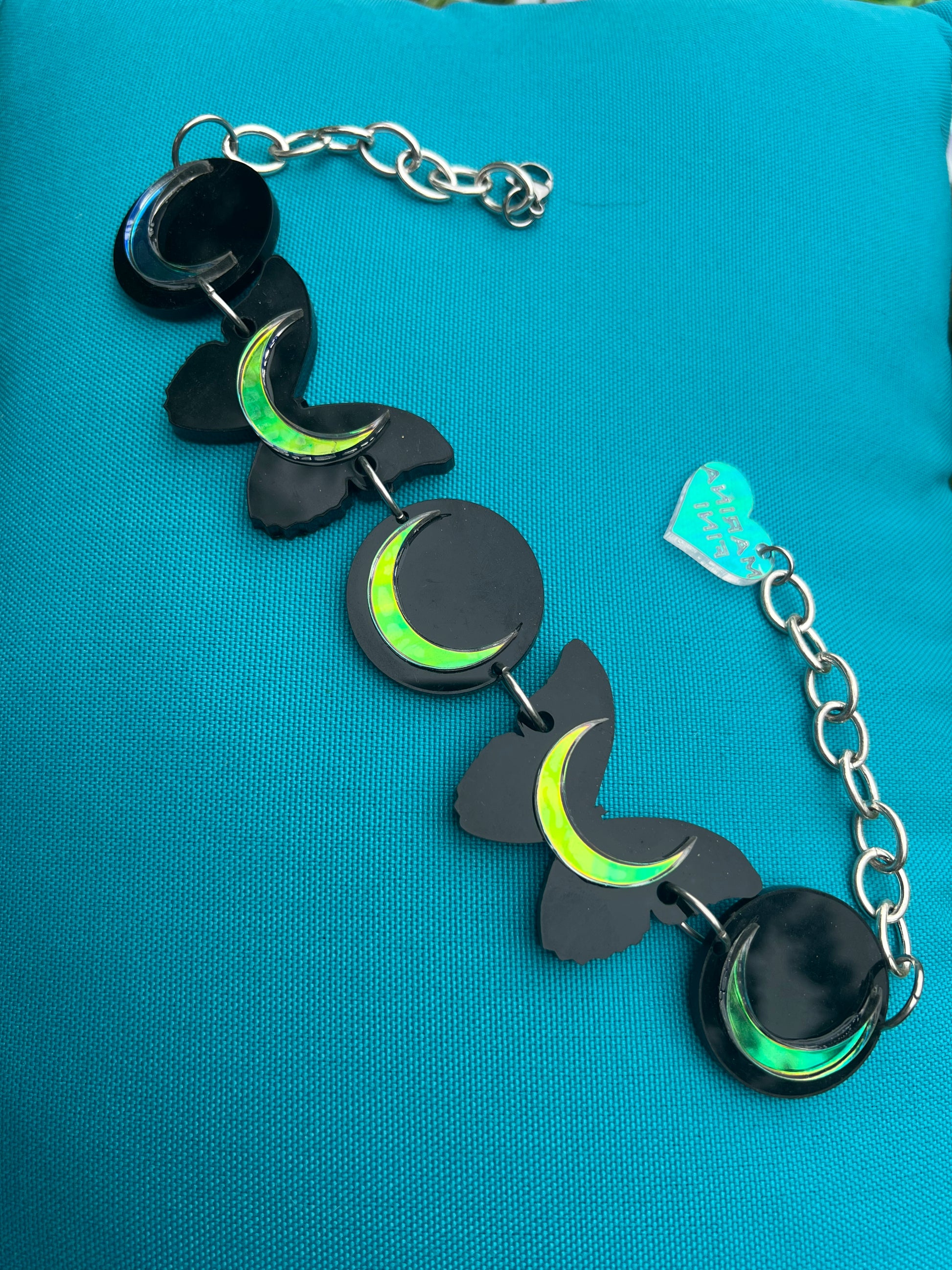 Our Signature Black Butterfly Luna choker with iridescent holographic crescent moons.