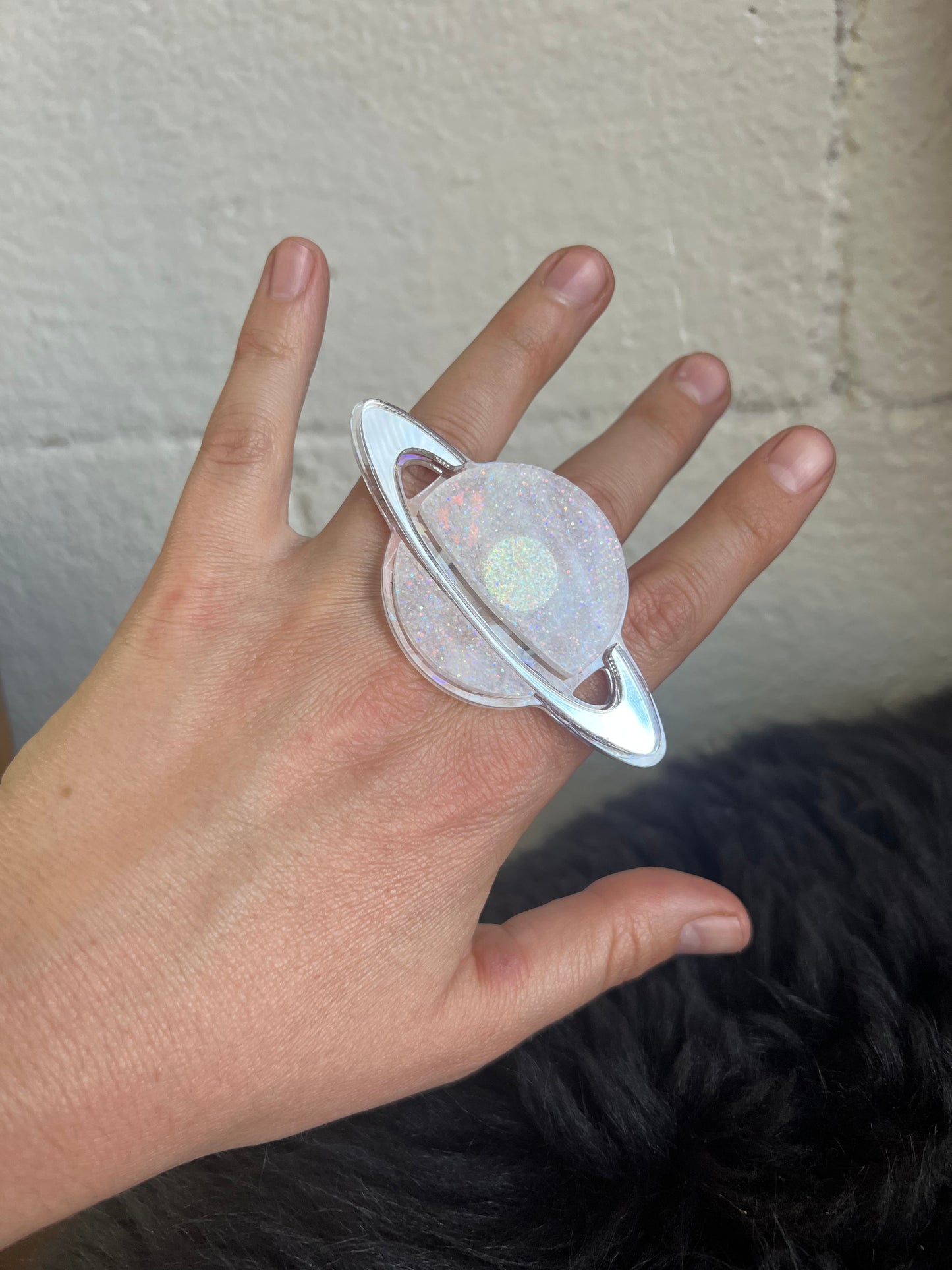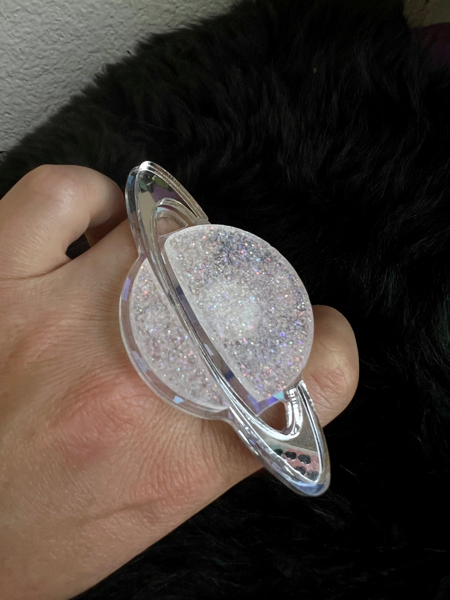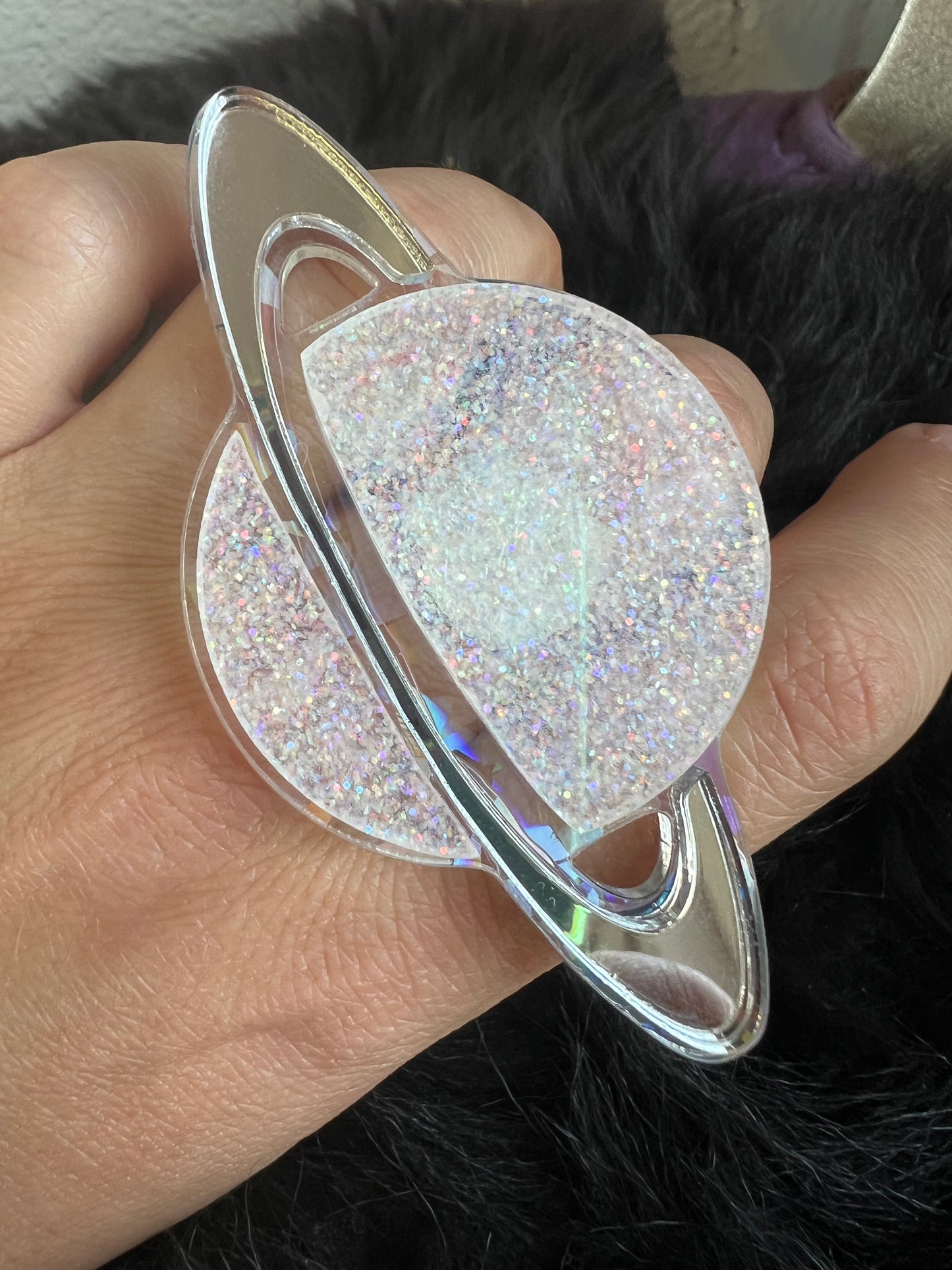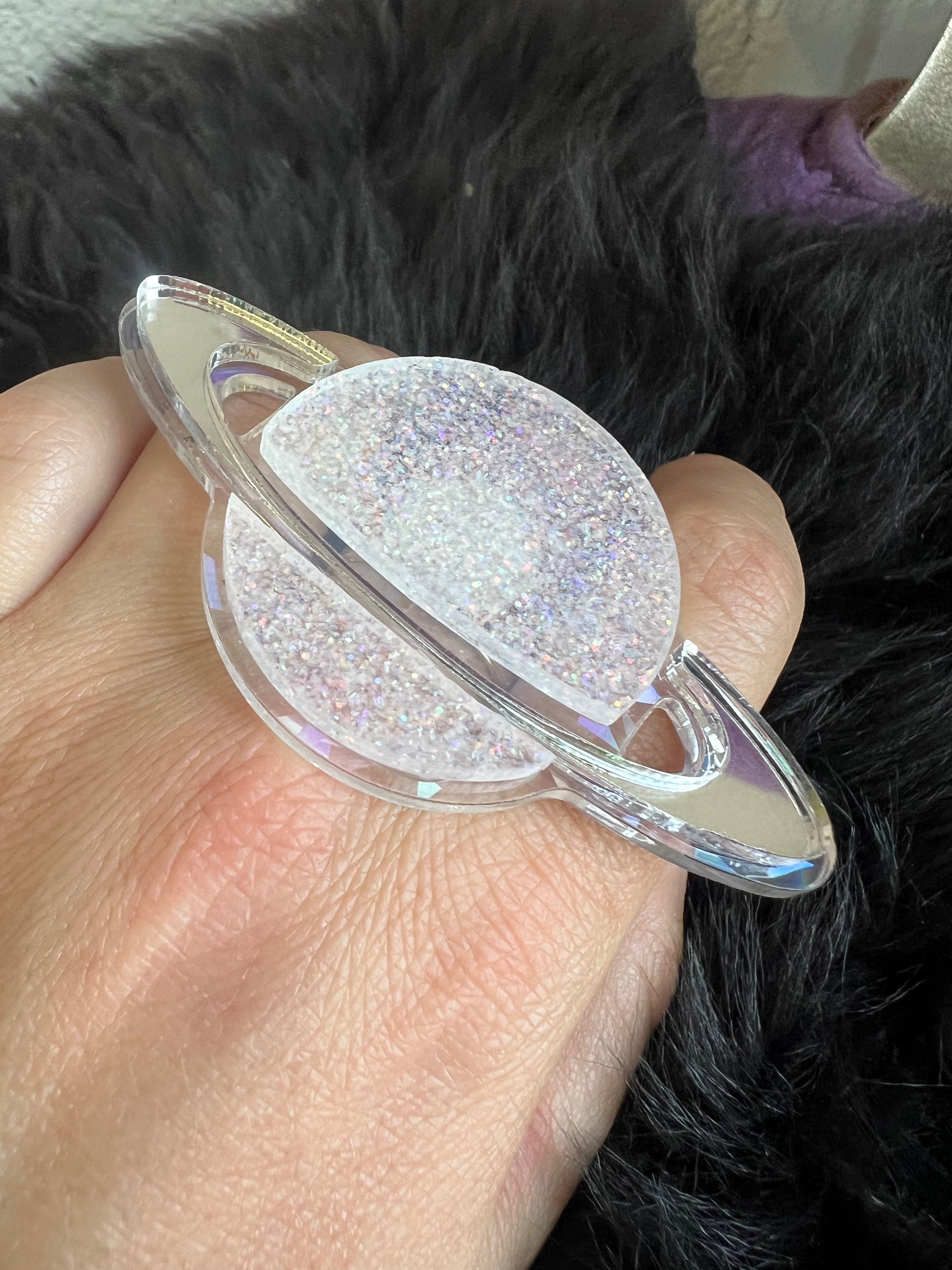 White glitter , silver and holographic saturn sparkle plexi ring.
