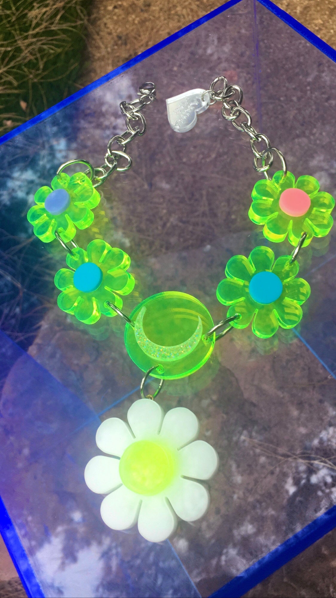 Neon green flower power plexiglass with moon center and white flower drip