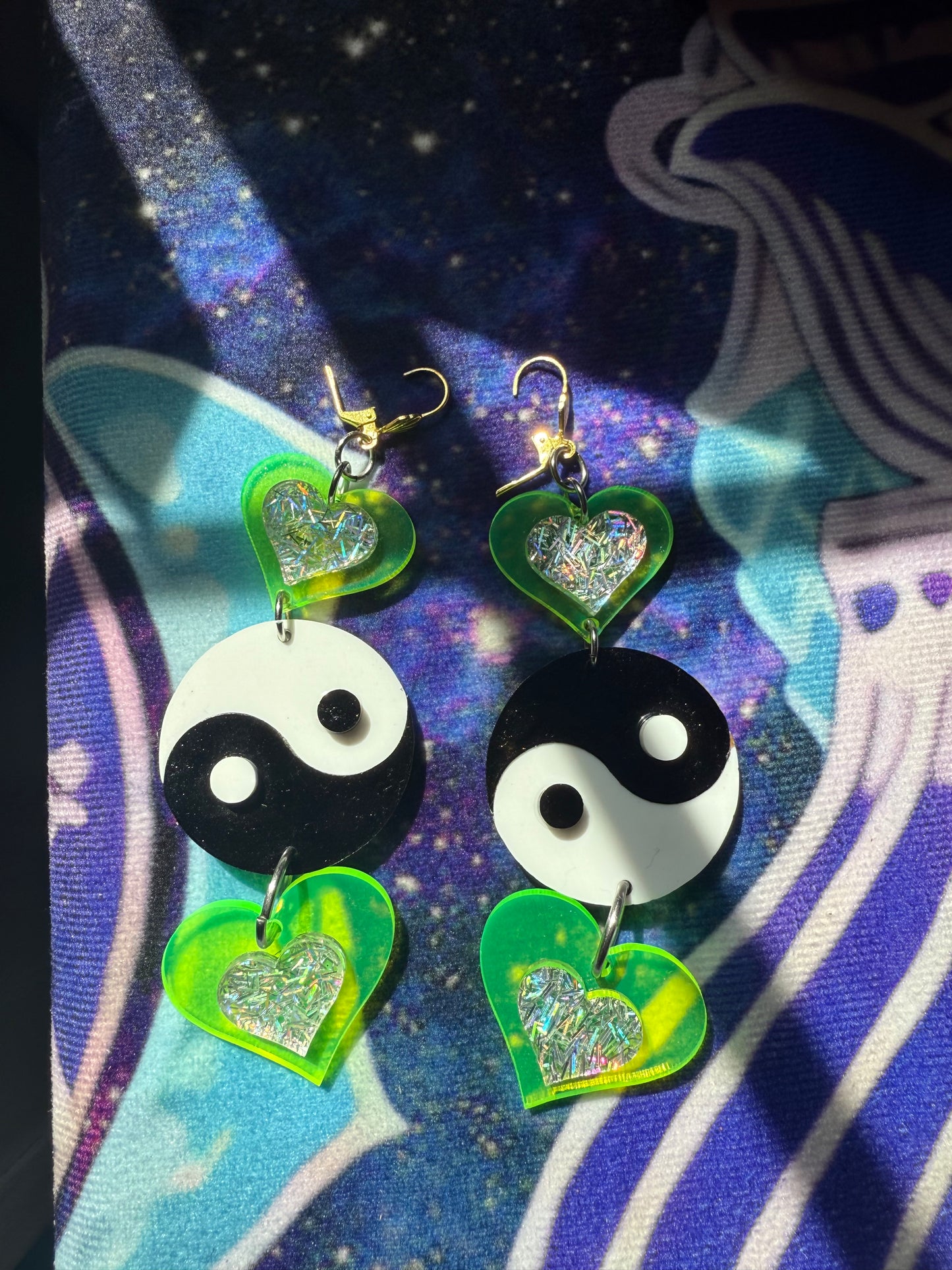 Neon green hearts and yinyang earrings .