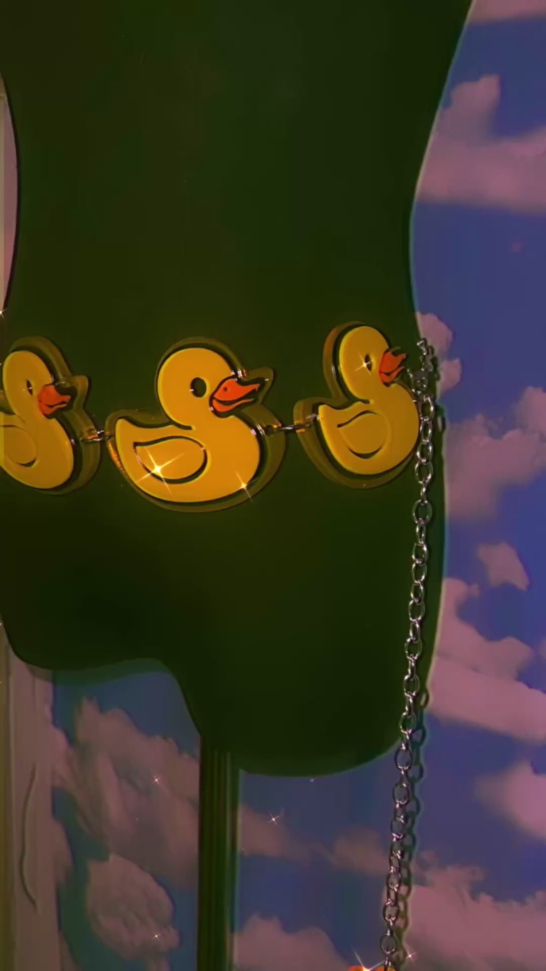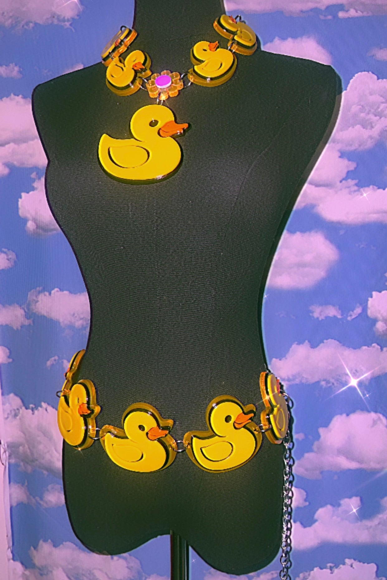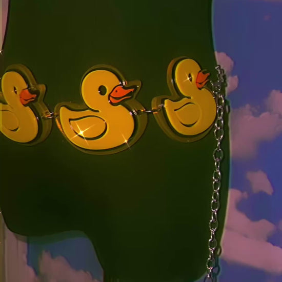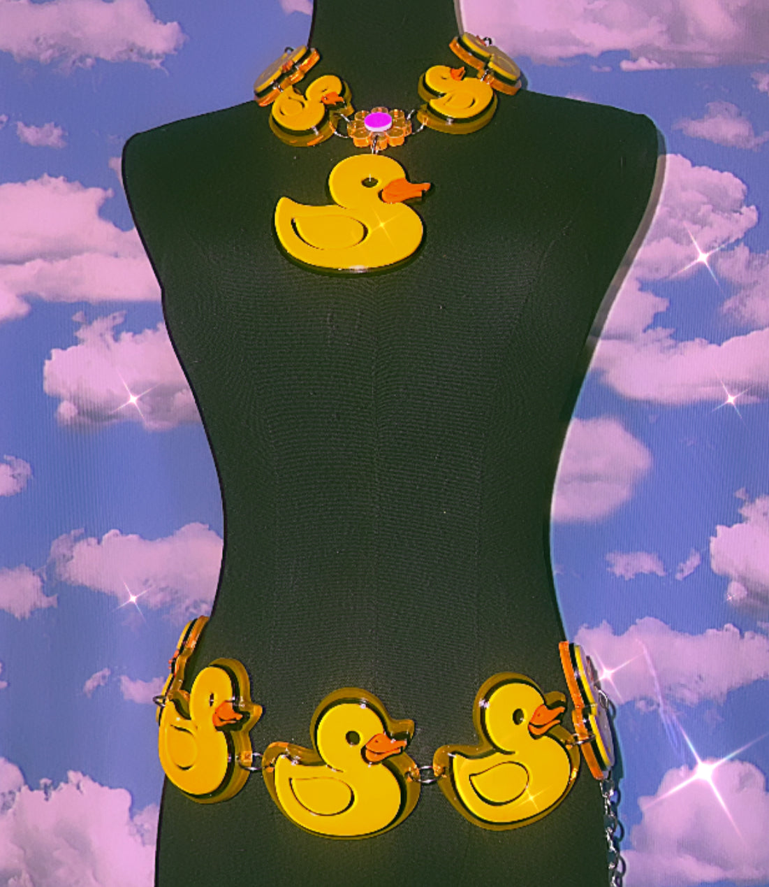 The necklace is made out of durable 1/4 inch thick orange plexi with layered duckies